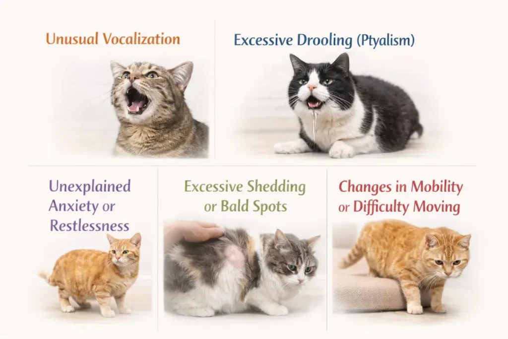 If your cat starts meowing excessively or making strange sounds, it could be a sign of pain, distress, or cognitive dysfunction. This is particularly common in older cats.